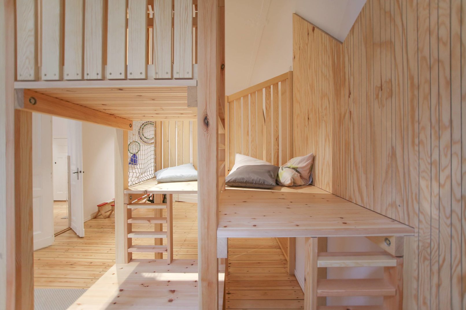 Um den Eindruck des typischen Berliner Altbaus zu erhalten setzten wir auf behutsame Eingriffe sowie Erhalt und Erneuerung der vorhandenen Substanz. Der Boden wurde überarbeitet, Türen geschliffen oder im alten Stil erneuert. Um die Anforderungen an den Schallschutz ohne Abhangdecken zu erfüllen, entwickelten wir Absorbersysteme, die wie Gestaltungselemente wirken und sich so harmonisch in den Raum einfügen. Mehrere Hochebenen bieten Rückzug, fördern Bewegung und bieten zusätzlichen Stauraum.