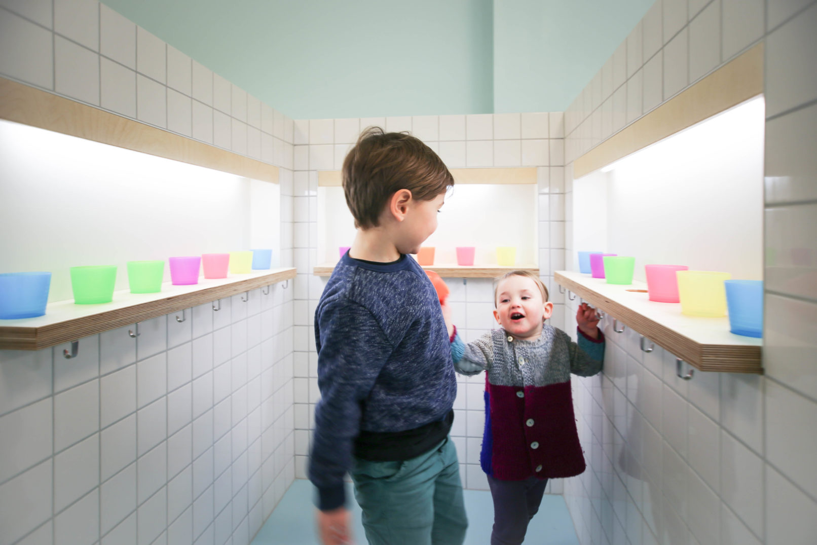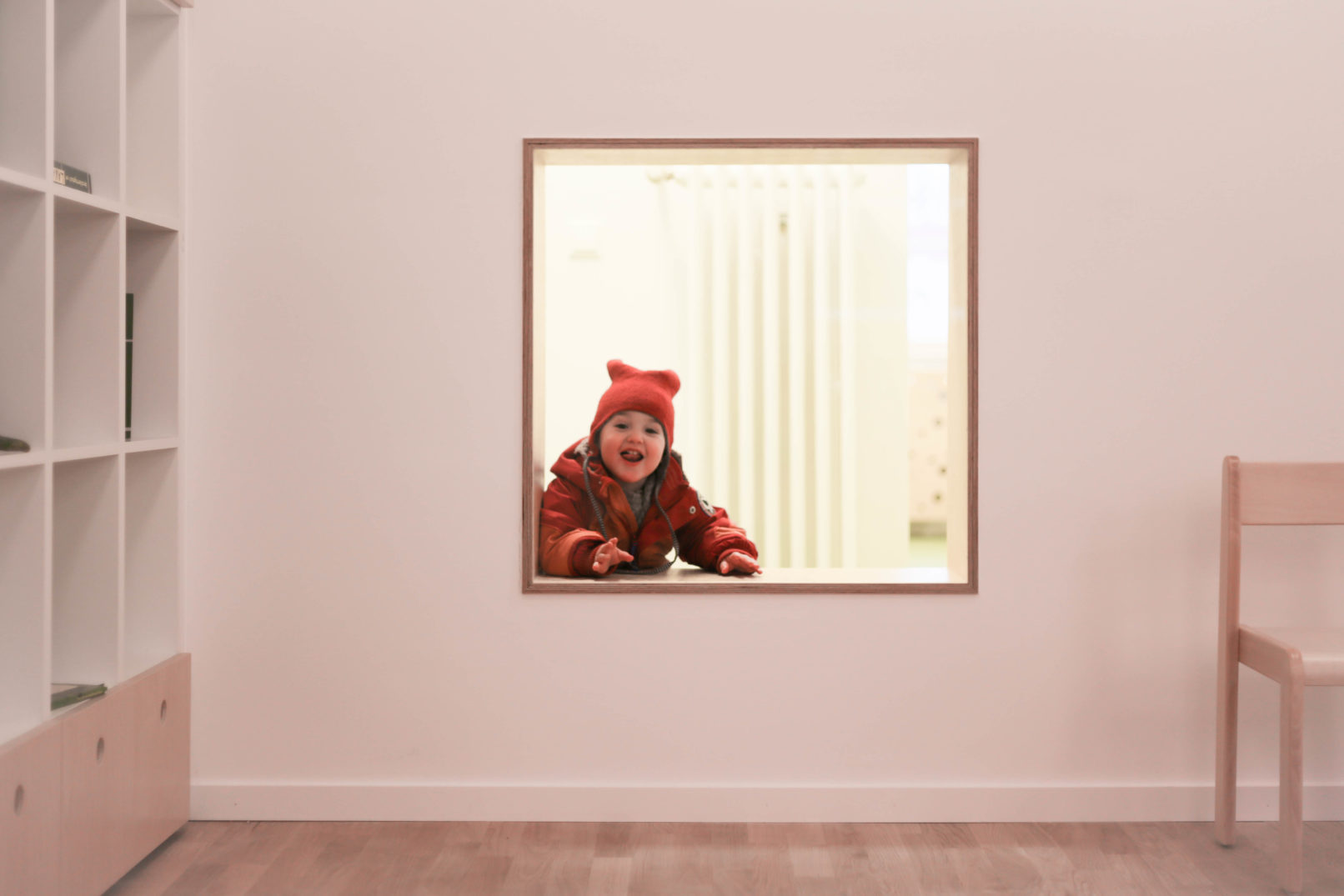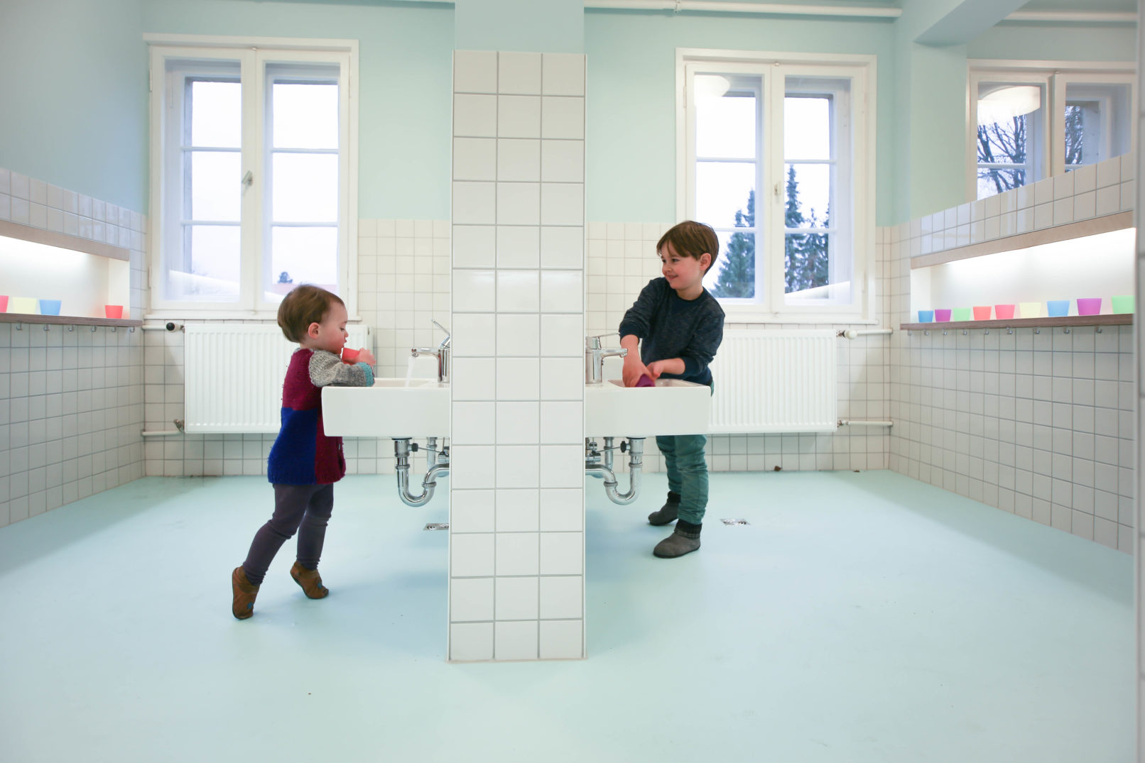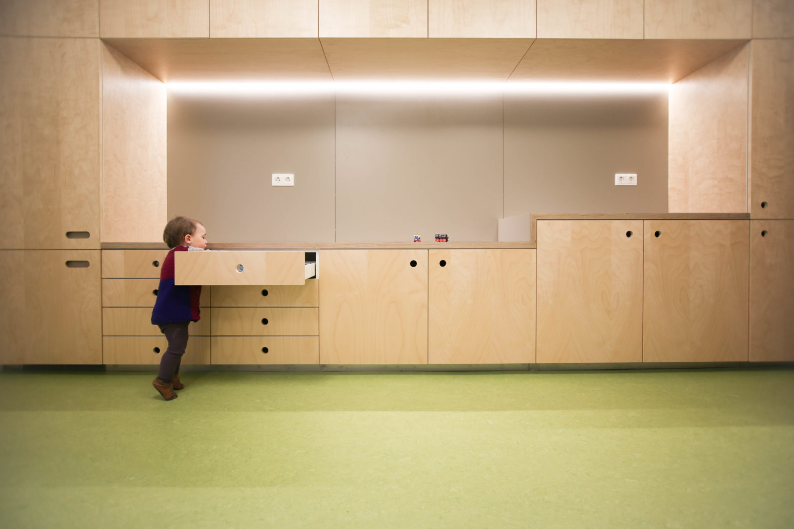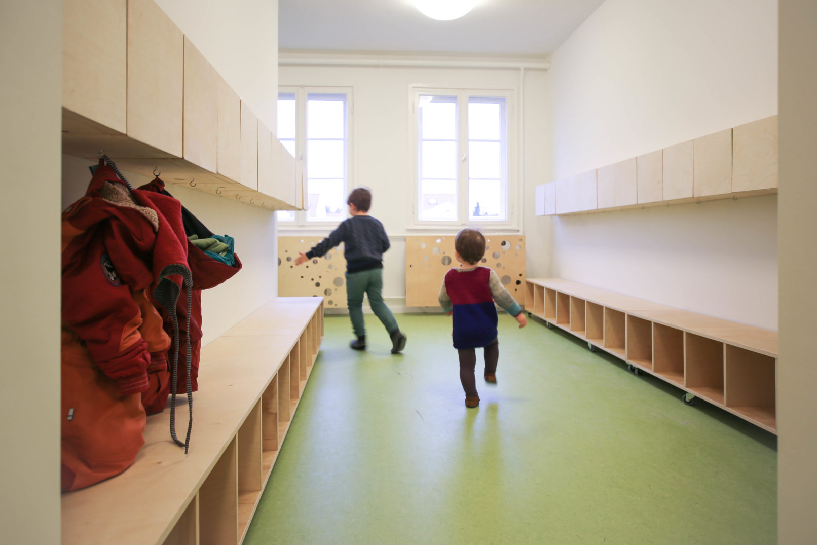 Der linke Flügel des ehemaligen Heimes für schwer erziehbare Mädchen war geprägt von einer rigiden Struktur mit Mittelgang und kleinen Einzelzimmern. Um weitere 60 Betreuungsplätze zu schaffen öffneten wir den Gang durch zahlreiche Innenfenster und entfernten nichttragende Innenwände. So entstand ein wohnlicher Gesamteindruck und ein pädagogisch vielseitig nutzbarer Raum. Die kindgerechte Küche wird mittlerweile auch gerne extern genutzt, um im Vorschulalter erste kulinarische Einblicke zu vermitteln.